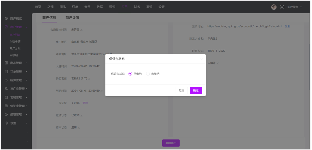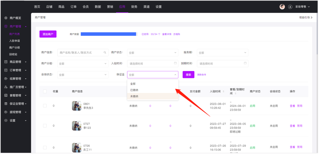 在主商城的商城列表会显示该商户是否缴纳保证金,还可以根据是否缴纳保证金来搜索相关商户。