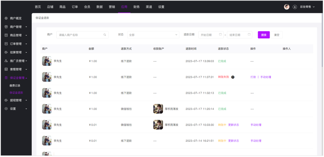 保证金支持退款,商户禁用或删除商户时可退还保证金。保证金退款方式支持线下退款、微信退款和支付宝退款。