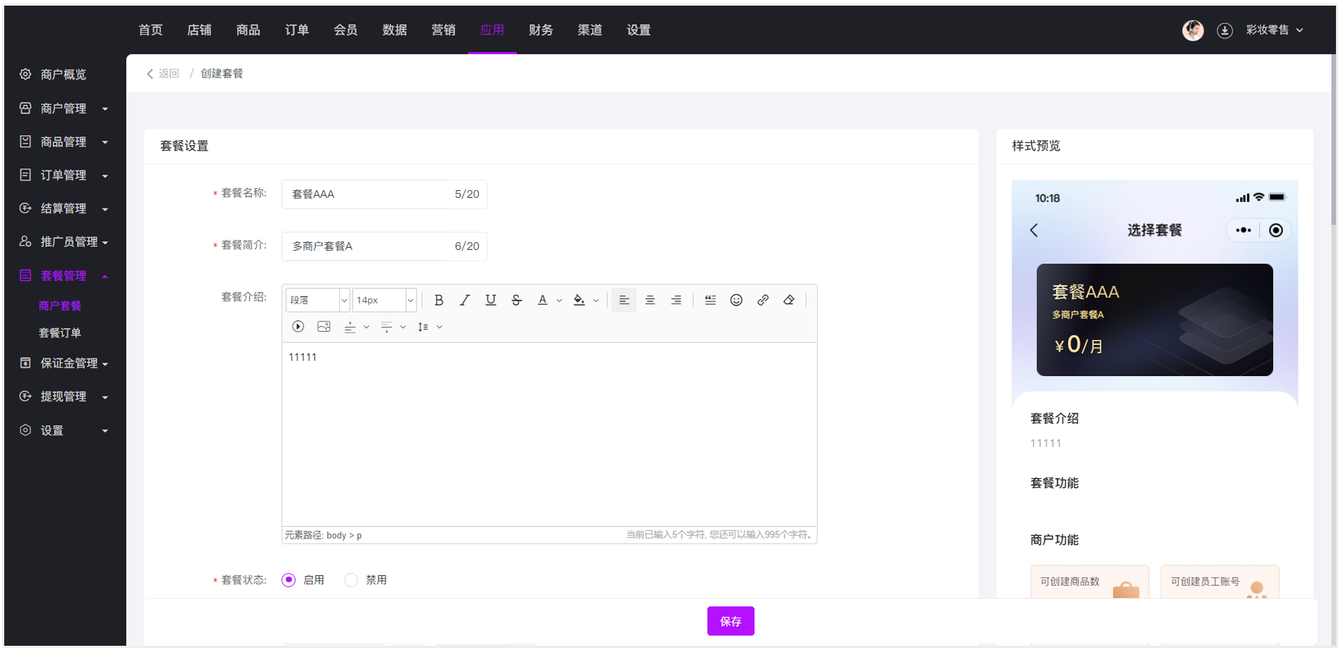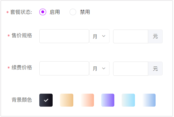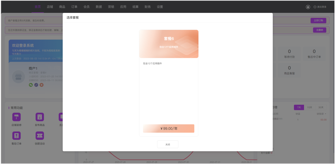 套餐价格、续费价格、商户限制、付款退款等都可以进行自定义设置。