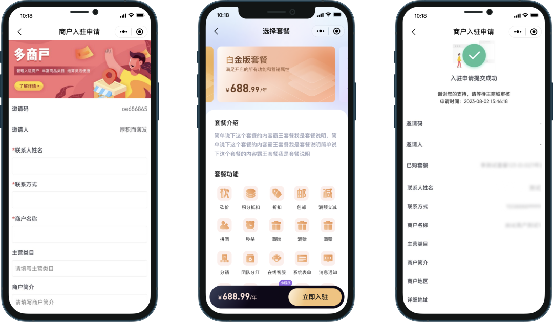 当启用“入驻购买套餐”后,商户在入驻时需先购买相应套餐才能提交申请。