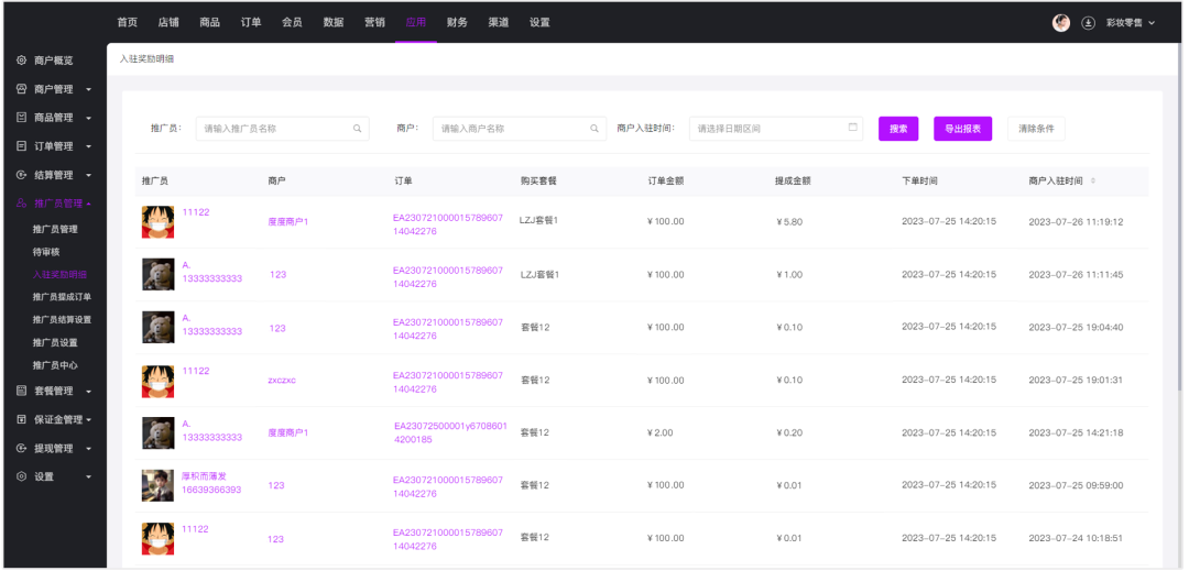 您可以在入驻奖励明细页面查看推广员的推广信息。