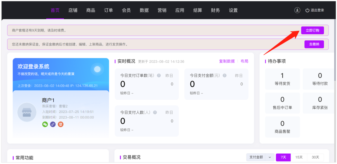 子商户点击首页“立即订购”即可直接进行套餐续费。